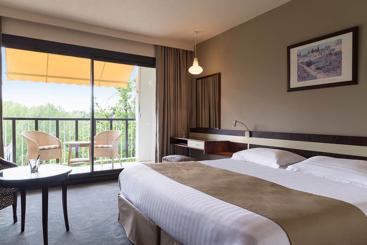Chambres doubles Tradition ou Grand Confort (possibilité d’usage single) : côté Ouest, ces chambres bénéficient d’une agréable loggia qui vous permettra de prendre votre petit-déjeuner dehors en toute intimité (avec supplément). Côté colline (Est), ces chambres tradition sont bercées par le murmure de la nature avec balcon. Ces chambres spacieuses, à grand lit (160cm) ou à deux lits, feront de votre séjour un véritable moment de tranquillité et de douceur.